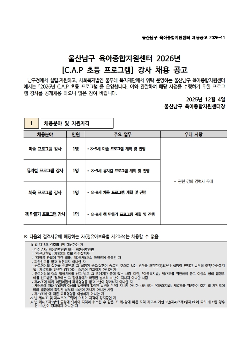 ºÙÀÓ1.¿ï»ê³²±¸ À°¾ÆÁ¾ÇÕÁö¿ø¼¾ÅÍ C.A.P Ãʵî ÇÁ·Î±×·¥ °»ç ä¿ë °ø°í¹®(Á¦2025-11È£).pdf