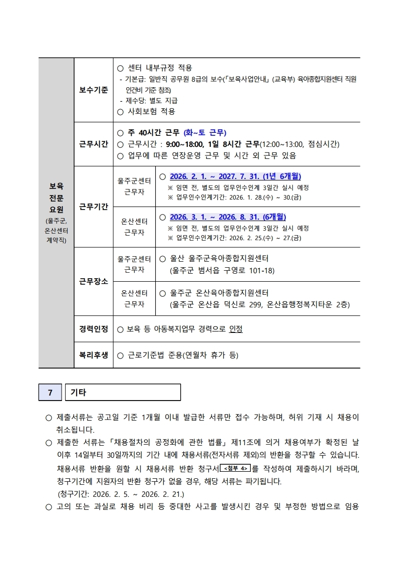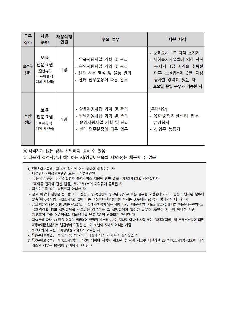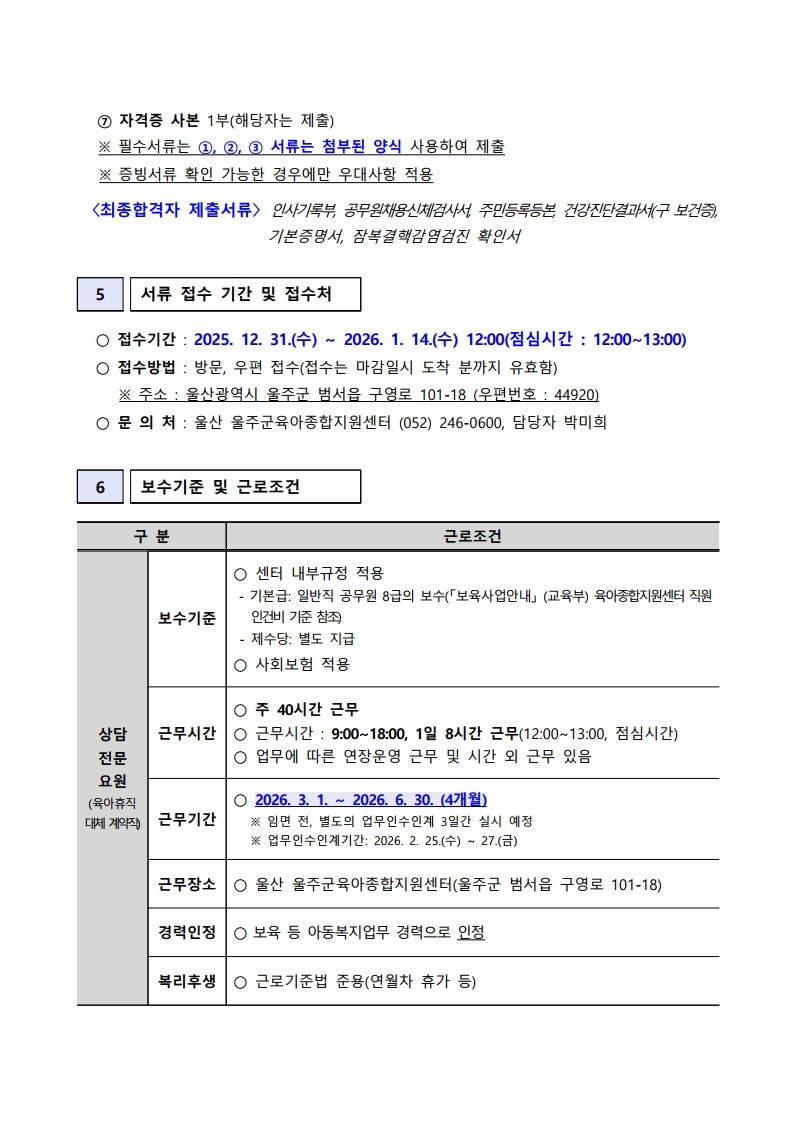 [ä¿ë°ø°í] ¿ï»ê ¿ïÁÖ±ºÀ°¾ÆÁ¾ÇÕÁö¿ø¼¾ÅÍ ±â°£Á¦±Ù·ÎÀÚ(»ó´ãÀü¹®¿ä¿ø, º¸À°Àü¹®¿ä¿ø) ä¿ë°ø°í