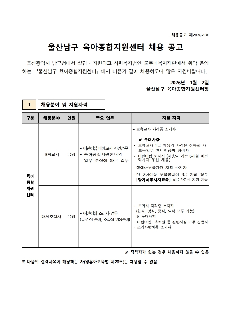 [ä¿ë°ø°í] ¿ï»ê ³²±¸ À°¾ÆÁ¾ÇÕÁö¿ø¼¾ÅÍ Á÷¿ø(´ëü±³»ç ¹× ´ëüÁ¶¸®»ç) °ø°í