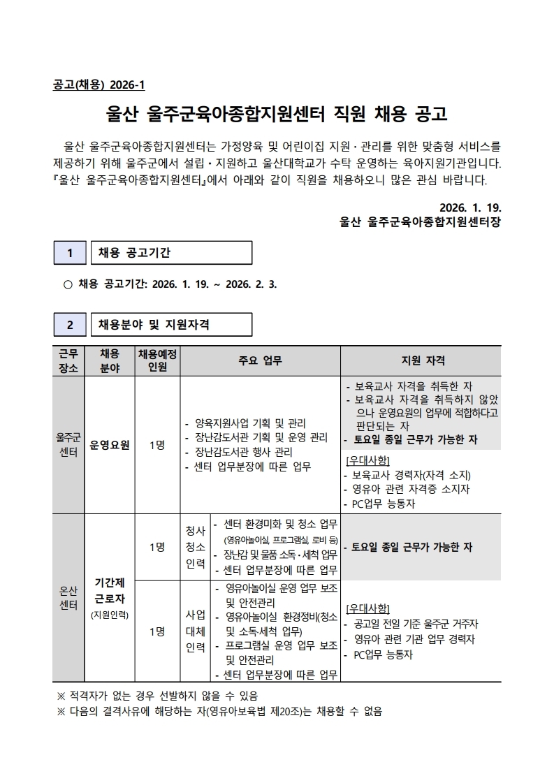 [ä¿ë°ø°í] ¿ï»ê ¿ïÁÖ±ºÀ°¾ÆÁ¾ÇÕÁö¿ø¼¾ÅÍ Á÷¿ø(¿î¿µ¿ä¿ø, ±â°£Á¦ ±Ù·ÎÀÚ) ä¿ë°ø°í