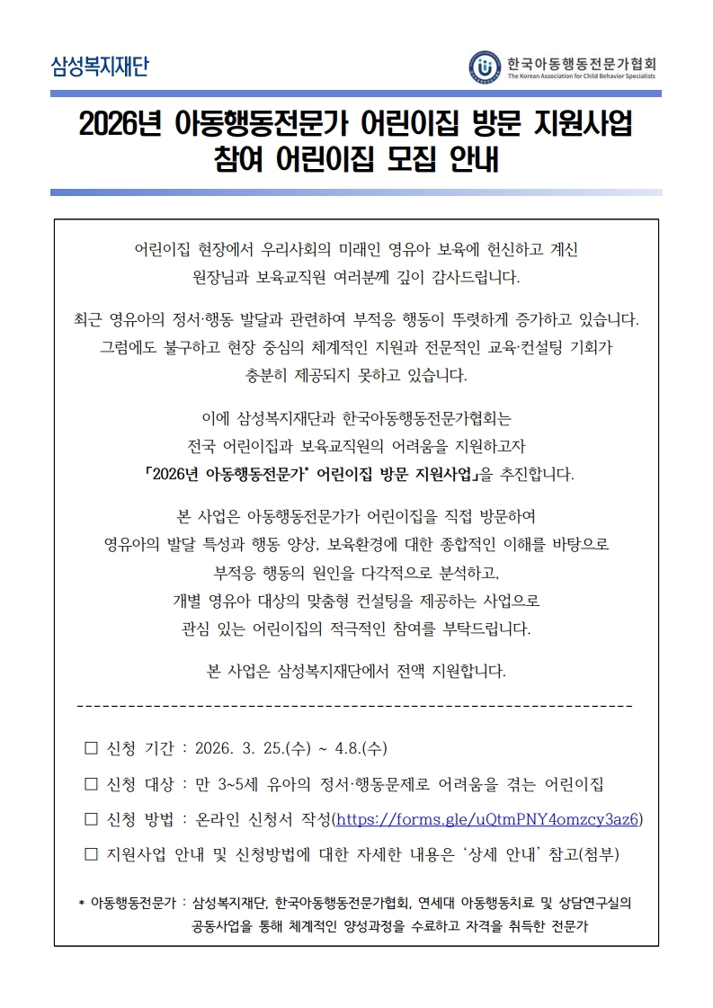 [»ï¼ºº¹ÁöÀç´Ü] 2026³â ¾Æµ¿ÇൿÀü¹®°¡ ¾î¸°ÀÌÁý ¹æ¹® Áö¿ø»ç¾÷ Âü¿© ¾î¸°ÀÌÁý ¸ðÁý ¾È³»