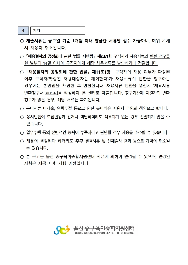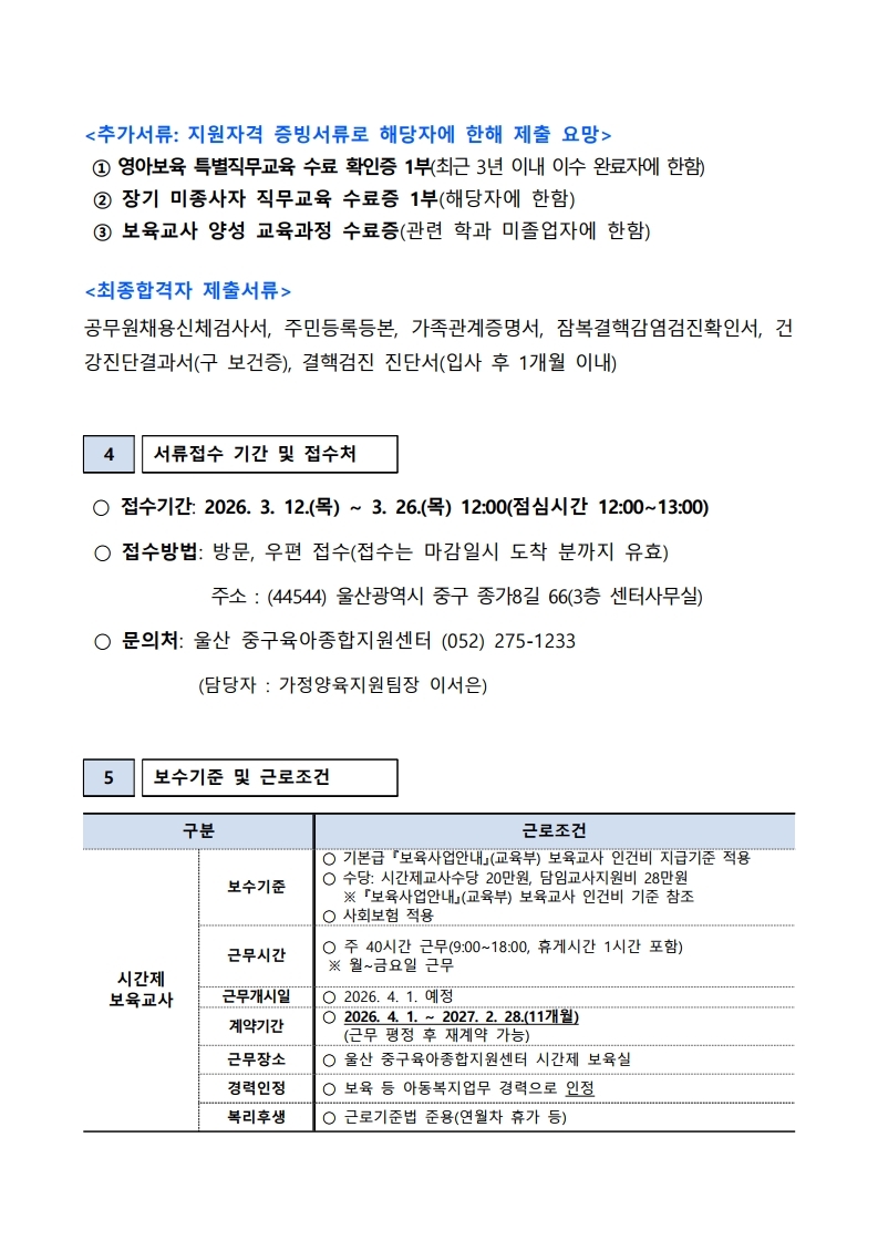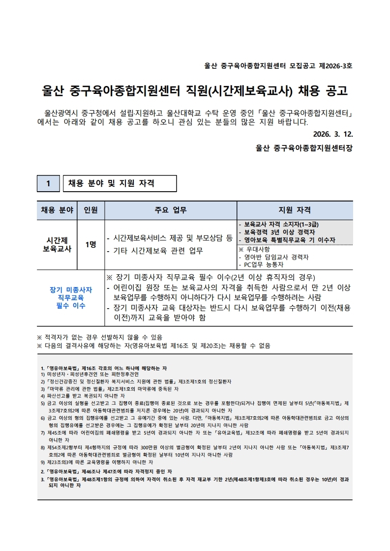 [ä¿ë°ø°í] ¿ï»ê Áß±¸À°¾ÆÁ¾ÇÕÁö¿ø¼¾ÅÍ Á÷¿ø(½Ã°£Á¦º¸À°±³»ç) ä¿ë °ø°í