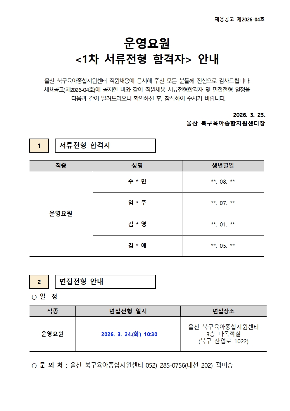 º» ¼¾ÅÍ ¿î¿µ¿ä¿ø <1Â÷ ¼·ùÀüÇü ÇÕ°ÝÀÚ> ¾È³»