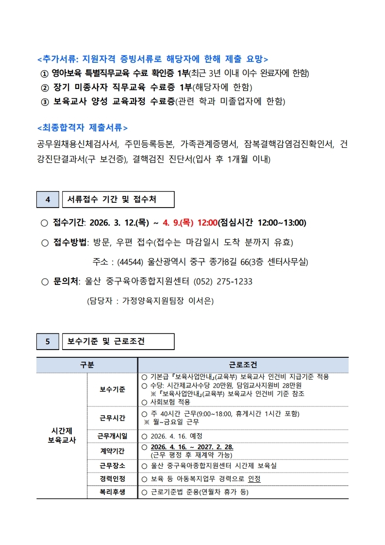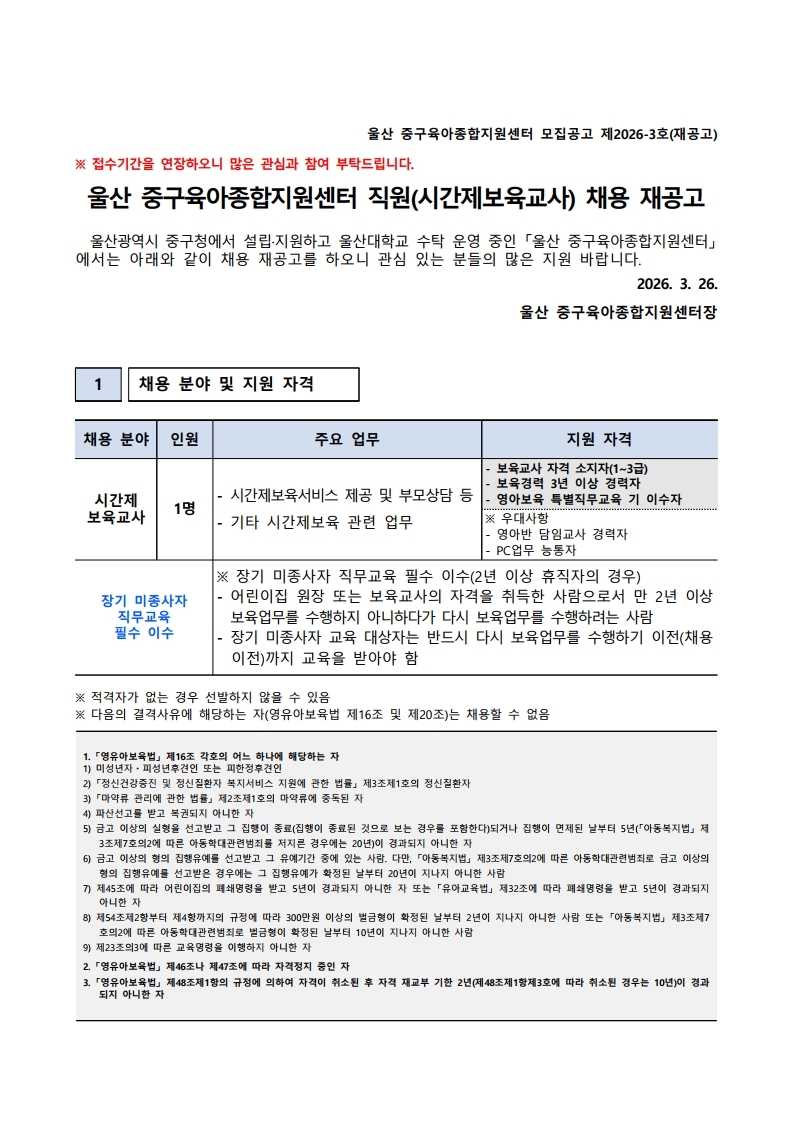 [ä¿ë°ø°í] ¿ï»ê Áß±¸À°¾ÆÁ¾ÇÕÁö¿ø¼¾ÅÍ Á÷¿ø(½Ã°£Á¦º¸À°±³»ç) ä¿ë Àç°ø°í
