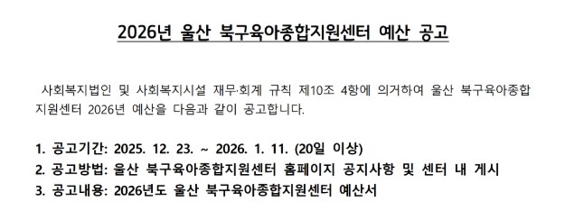 2026³â ¿ï»ê ºÏ±¸À°¾ÆÁ¾ÇÕÁö¿ø¼¾ÅÍ ¿¹»ê °ø°í