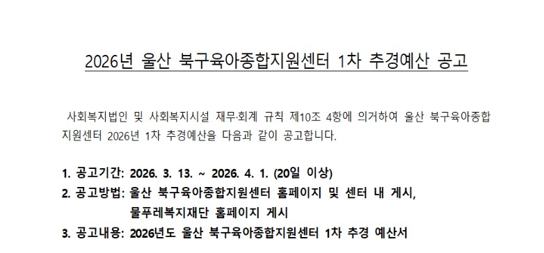 2026³â ¿ï»ê ºÏ±¸À°¾ÆÁ¾ÇÕÁö¿ø¼¾ÅÍ 1Â÷ Ã߰濹»ê °ø°í