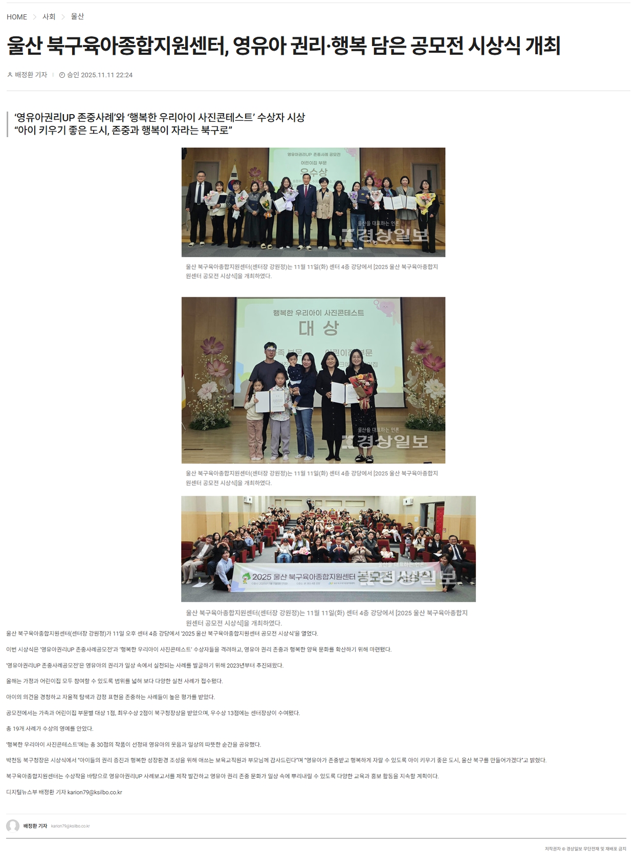 | [°æ»óÀϺ¸] ¿ï»ê ºÏ±¸À°¾ÆÁ¾ÇÕÁö¿ø¼¾ÅÍ, ¿µÀ¯¾Æ ±Ç¸®¡¤Çູ ´ãÀº °ø¸ðÀü ½Ã»ó½Ä °³ÃÖ | |||||