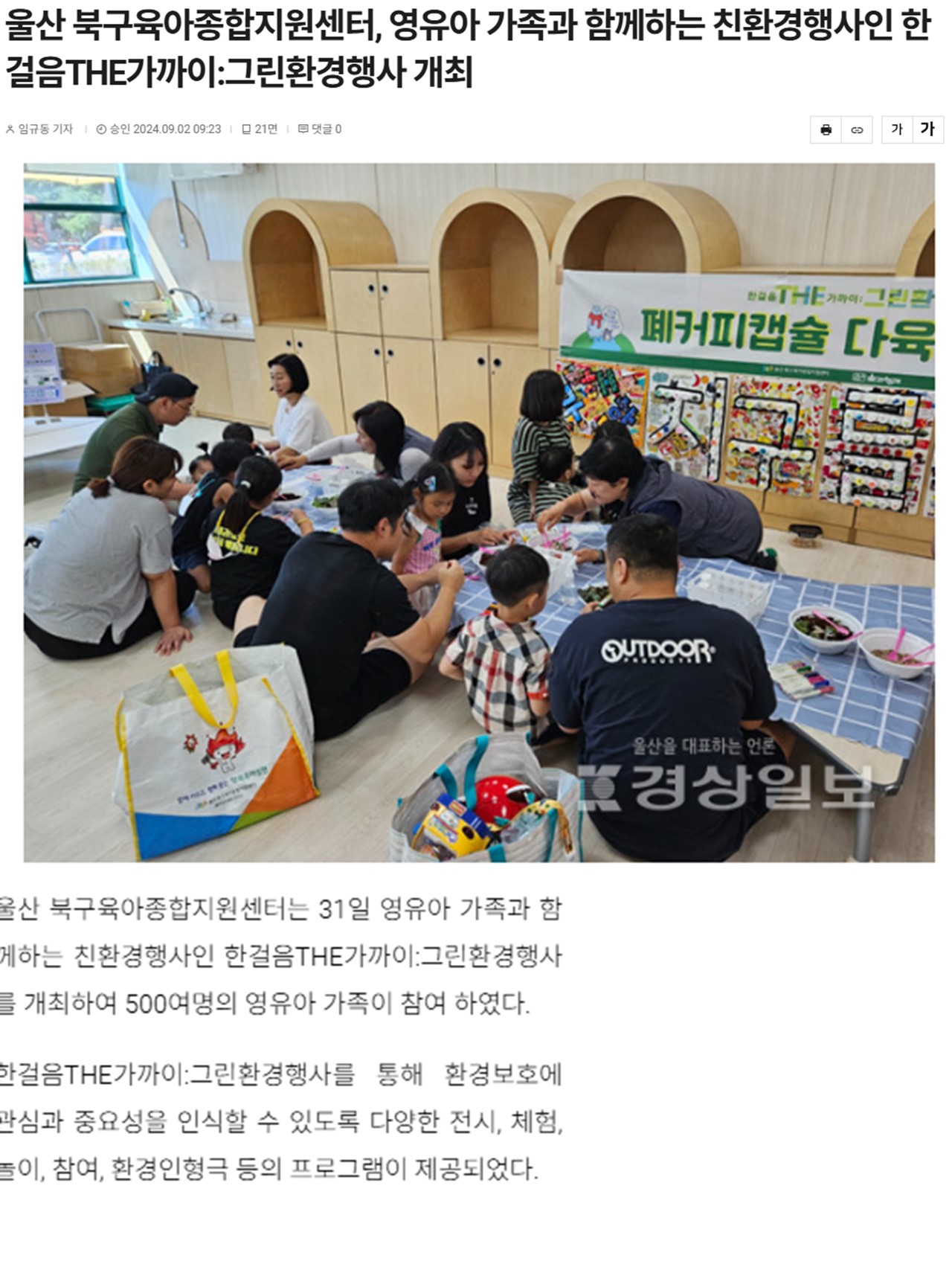 [°æ»óÀϺ¸] ¿ï»ê ºÏ±¸À°¾ÆÁ¾ÇÕÁö¿ø¼¾ÅÍ, ¿µÀ¯¾Æ °¡Á·°ú ÇÔ²²Çϴ ģȯ°æÇà»çÀÎ ÇѰÉÀ½THE°¡±îÀÌ:±×¸°È¯°æÇà»ç °³ÃÖ