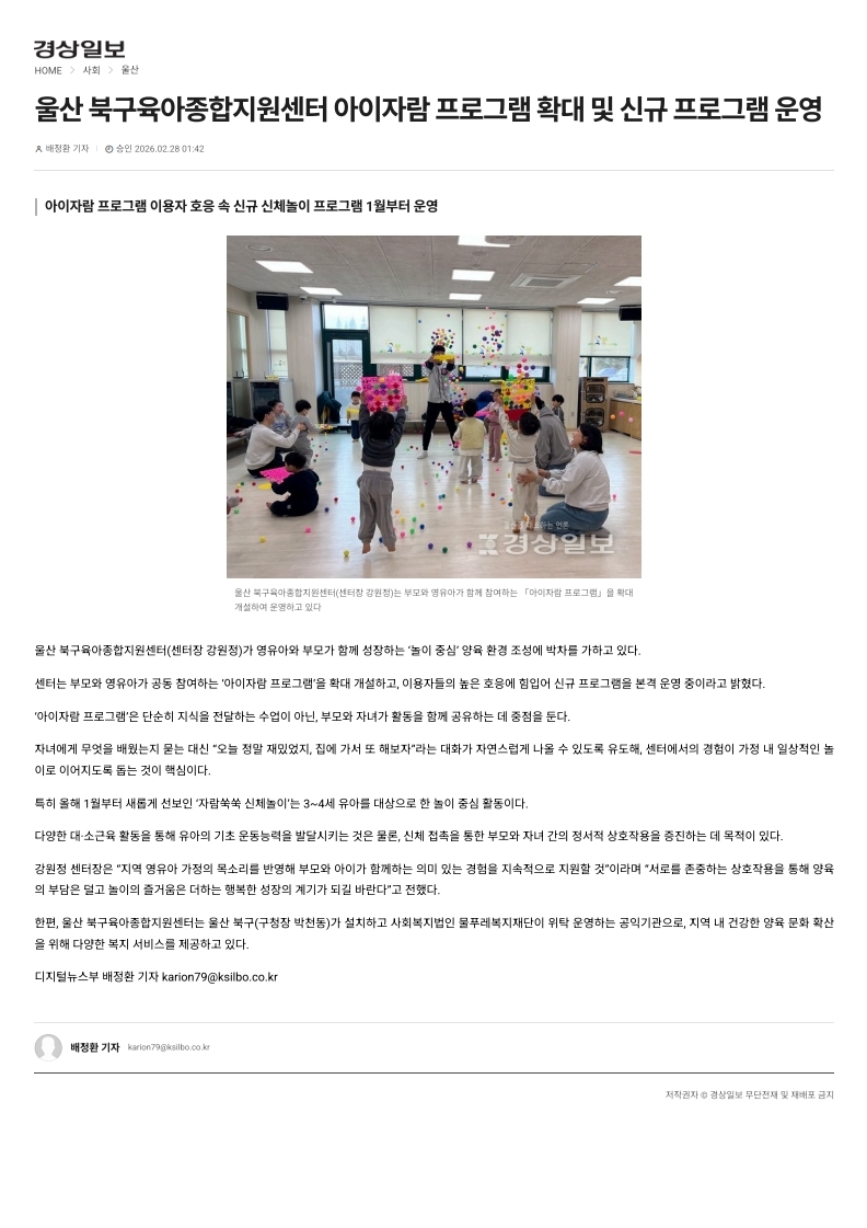 [°æ»óÀϺ¸] ¿ï»ê ºÏ±¸À°¾ÆÁ¾ÇÕÁö¿ø¼¾ÅÍ ¾ÆÀÌÀÚ¶÷ ÇÁ·Î±×·¥ È®´ë ¹× ½Å±Ô ÇÁ·Î±×·¥ ¿î¿µ