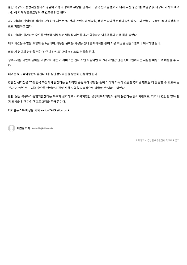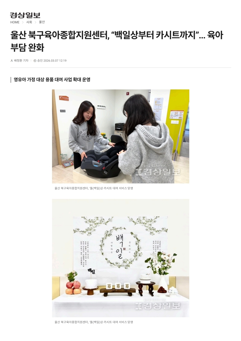 [°æ»óÀϺ¸] ¿ï»ê ºÏ±¸À°¾ÆÁ¾ÇÕÁö¿ø¼¾ÅÍ, ¡°¹éÀÏ»óºÎÅÍ Ä«½ÃÆ®±îÁö¡±... À°¾Æ ºÎ´ã ¿ÏÈ