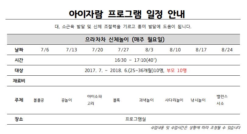| ±âŸ»çÇ× | 5¿ù¿¡ ½ÃÀÛ ¿¹Á¤ÀÌ¿´´ø ¾ÆÀÌÀÚ¶÷ ÇÁ·Î±×·¥Àº Äڷγª19·Î ÀÎÇØ 7¿ù ½ÃÀÛ ¿¹Á¤ÀÔ´Ï´Ù. ±âÁ¸ 5,6¿ù ÇÁ·Î±×·¥ ½ÅûÀÚ´Â 7,8¿ù ÇÁ·Î±×·¥À¸·Î ÀÚµ¿ ÀÌ¿ù ½ÅûµÇ´Ï Âü°íÇϽñ⠹ٶø´Ï´Ù. 8¿ù 17ÀÏ¡æ8¿ù 31ÀÏ ¼ö¾÷ º¯°æµÇ¾ú½À´Ï´Ù. |