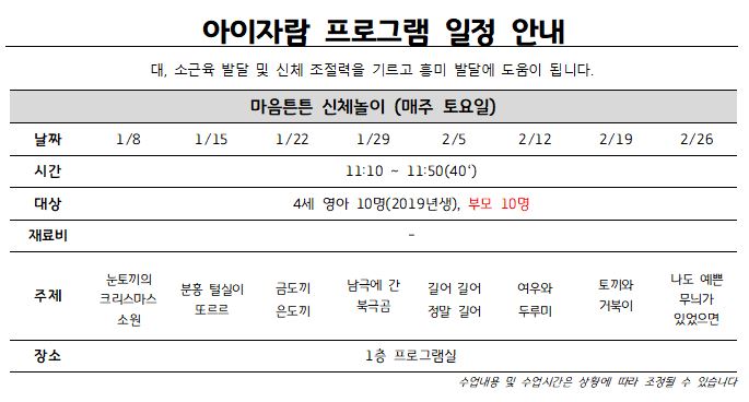 | ±âŸ»çÇ× | ¨ç4¼¼ (2019³â»ý) ¿µ¾Æ¿Í ºÎ¸ð°¡ ÇÔ²² Âü¿© °¡´ÉÇÕ´Ï´Ù. ¨èÂü°¡ºñ °áÁ¦´Â ÇÁ·Î±×·¥ ù ³¯ Ä«µå°áÁ¦ÇÕ´Ï´Ù. *Äڷγª19 È®»ê »óȲ¿¡ µû¶ó ÇÁ·Î±×·¥ÀÌ º¯°æµÇ°Å³ª Ãë¼ÒµÉ ¼ö ÀÖ½À´Ï´Ù. |