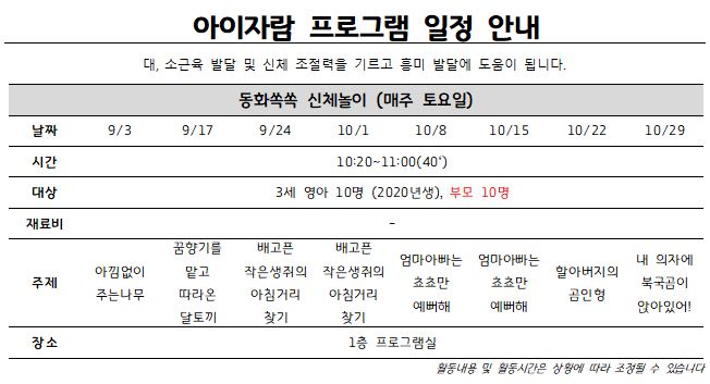 | ±âŸ»çÇ× | ¨ç3¼¼ ¿µ¾Æ¿Í ºÎ¸ð°¡ ÇÔ²² Âü¿© °¡´ÉÇÕ´Ï´Ù. ¨èÂü°¡ºñ °áÁ¦´Â ÇÁ·Î±×·¥ ù ³¯ Ä«µå°áÁ¦ÇÕ´Ï´Ù. *Äڷγª19 È®»ê »óȲ¿¡ µû¶ó ÇÁ·Î±×·¥ÀÌ º¯°æµÇ°Å³ª Ãë¼ÒµÉ ¼ö ÀÖ½À´Ï´Ù. |