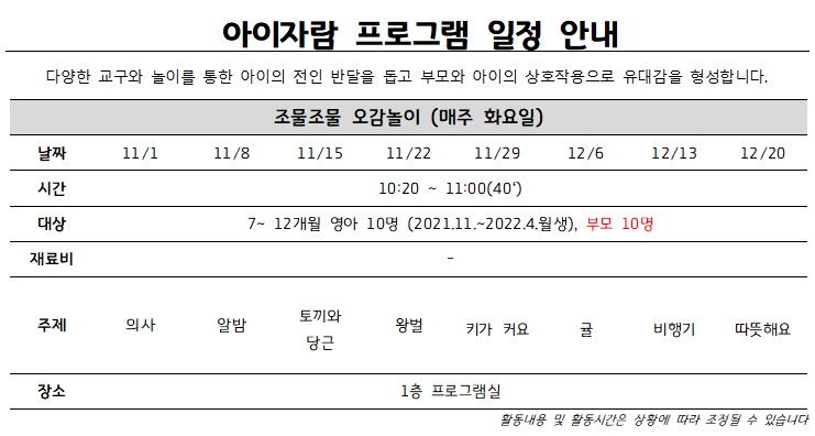| ±âŸ»çÇ× | ¨ç7~12°³¿ù ¿µ¾Æ¿Í ºÎ¸ð°¡ ÇÔ²² Âü¿© °¡´ÉÇÕ´Ï´Ù. ¨èÂü°¡ºñ °áÁ¦´Â ÇÁ·Î±×·¥ ù ³¯ Ä«µå°áÁ¦ÇÕ´Ï´Ù. *Äڷγª19 È®»ê »óȲ¿¡ µû¶ó ÇÁ·Î±×·¥ÀÌ º¯°æµÇ°Å³ª Ãë¼ÒµÉ ¼ö ÀÖ½À´Ï´Ù. |