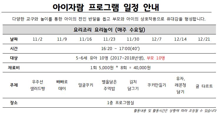 | ±âŸ»çÇ× | ¨ç5~6¼¼ À¯¾Æ¿Í ºÎ¸ð°¡ ÇÔ²² Âü¿© °¡´ÉÇÕ´Ï´Ù. ¨èÂü°¡ºñ °áÁ¦´Â ÇÁ·Î±×·¥ ù ³¯ Ä«µå°áÁ¦ÇÕ´Ï´Ù. *Àç·áºñ´Â 5000¿ø(1ȸ)x8ȸ = 40,000¿ø ÀÔ´Ï´Ù. *Äڷγª19 È®»ê »óȲ¿¡ µû¶ó ÇÁ·Î±×·¥ÀÌ º¯°æµÇ°Å³ª Ãë¼ÒµÉ ¼ö ÀÖ½À´Ï´Ù. |