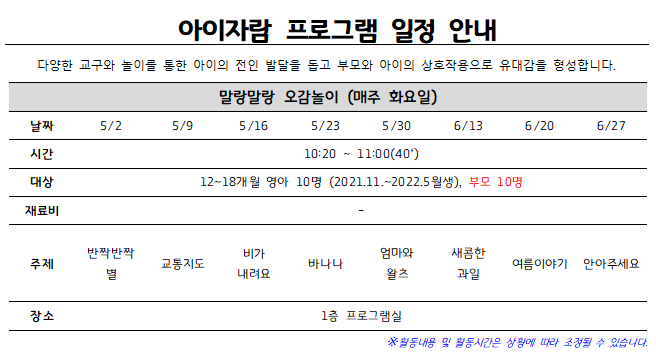 | ±âŸ»çÇ× | ¨ç12~18°³¿ù ¿µ¾Æ¿Í ºÎ¸ð°¡ ÇÔ²² Âü¿© °¡´ÉÇÕ´Ï´Ù. ¨èÂü°¡ºñ °áÁ¦´Â ÇÁ·Î±×·¥ ù ³¯ Ä«µå°áÁ¦ÇÕ´Ï´Ù. *Äڷγª19 È®»ê »óȲ¿¡ µû¶ó ÇÁ·Î±×·¥ÀÌ º¯°æµÇ°Å³ª Ãë¼ÒµÉ ¼ö ÀÖ½À´Ï´Ù. |