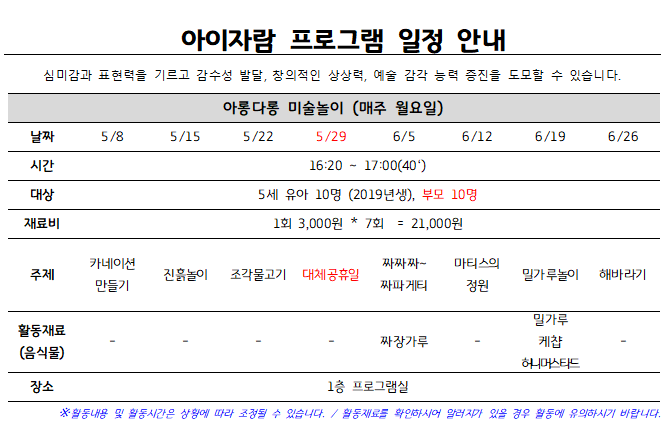 | ±âŸ»çÇ× | ¨ç5¼¼ À¯¾Æ¿Í ºÎ¸ð°¡ ÇÔ²² Âü¿© °¡´ÉÇÕ´Ï´Ù. ¨èÂü°¡ºñ °áÁ¦´Â ÇÁ·Î±×·¥ ù ³¯ Ä«µå°áÁ¦ÇÕ´Ï´Ù. *Àç·áºñ´Â 3,000(1ȸ)x7ȸ = 21,000¿ø ÀÔ´Ï´Ù. *Äڷγª19 È®»ê »óȲ¿¡ µû¶ó ÇÁ·Î±×·¥ÀÌ º¯°æµÇ°Å³ª Ãë¼ÒµÉ ¼ö ÀÖ½À´Ï´Ù. |