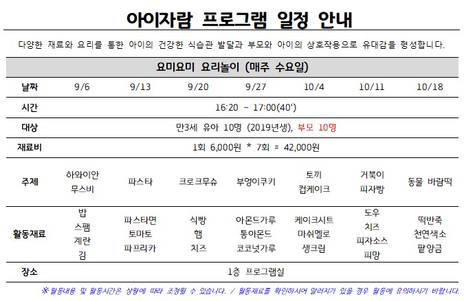 | ±âŸ»çÇ× | ¨ç¸¸3¼¼ À¯¾Æ¿Í ºÎ¸ð°¡ ÇÔ²² Âü¿© °¡´ÉÇÕ´Ï´Ù. ¨èÂü°¡ºñ °áÁ¦´Â ÇÁ·Î±×·¥ ù ³¯ Ä«µå°áÁ¦ÇÕ´Ï´Ù. *Àç·áºñ´Â 6,000¿ø(1ȸ)x7ȸ = 42,000¿ø ÀÔ´Ï´Ù. |