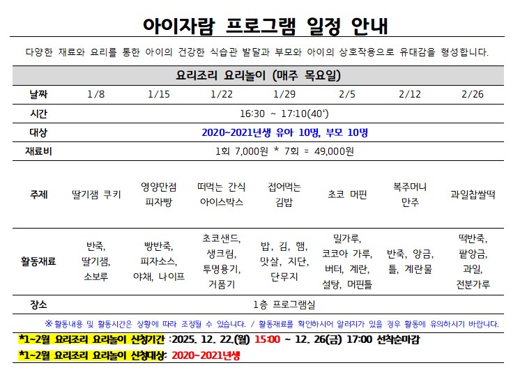 | ±âŸ»çÇ× | ¨ç 2020~2021³â»ý À¯¾Æ¿Í ºÎ¸ð°¡ ÇÔ²¾ Âü¿© °¡´ÉÇÕ´Ï´Ù. ¨è Âü°¡ºñ °áÁ¦´Â ÇÁ·Î±×·¥ ù ³¯ Ä«µå°áÁ¦ÇÕ´Ï´Ù. * Àç·áºñ´Â 7,000¿ø(1ȸ) x 7ȸ = 49,000¿ø ÀÔ´Ï´Ù. |