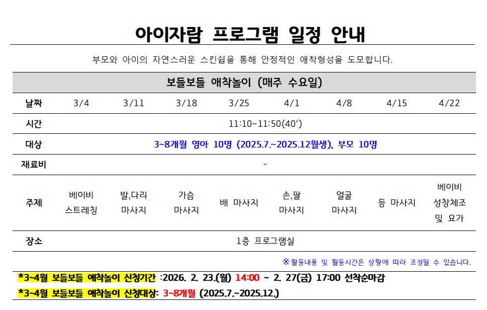 | ±âŸ»çÇ× | ¨ç 3~8°³¿ù ¿µ¾Æ¿Í ºÎ¸ð°¡ ÇÔ²² Âü¿© °¡´ÉÇÕ´Ï´Ù. ¨è Âü°¡ºñ °áÁ¦´Â ÇÁ·Î±×·¥ ù ³¯ Ä«µå°áÁ¦ÇÕ´Ï´Ù. |
