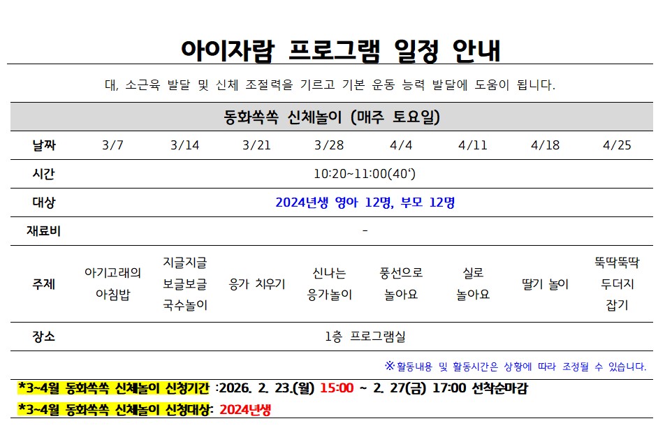| ±âŸ»çÇ× | ¨ç 2024³â»ý ¿µ¾Æ¿Í ºÎ¸ð°¡ ÇÔ²² Âü¿© °¡´ÉÇÕ´Ï´Ù. ¨è Âü°¡ºñ °áÁ¦´Â ÇÁ·Î±×·¥ ù ³¯ Ä«µå°áÁ¦ÇÕ´Ï´Ù. |