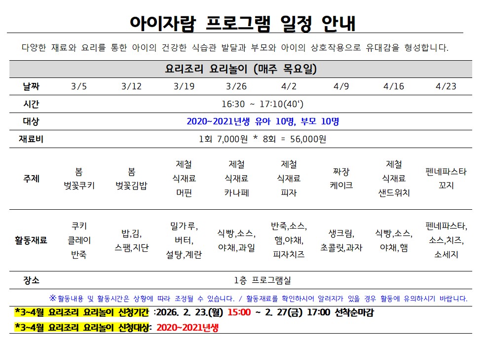 | ±âŸ»çÇ× | ¨ç 2020~2021³â»ý À¯¾Æ¿Í ºÎ¸ð°¡ ÇÔ²² Âü¿© °¡´ÉÇÕ´Ï´Ù. ¨è Âü°¡ºñ °áÁ¦´Â ÇÁ·Î±×·¥ ù ³¯ Ä«µå°áÁ¦ÇÕ´Ï´Ù. * Àç·áºñ´Â 7,000¿ø(1ȸ) x 8ȸ = 56,000¿ø ÀÔ´Ï´Ù. |
